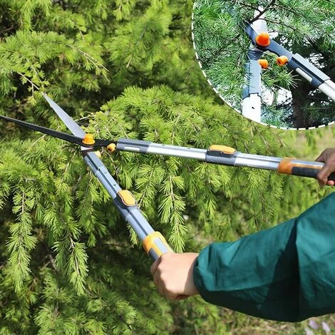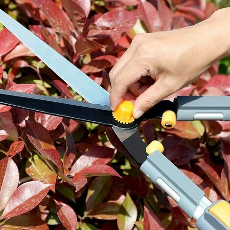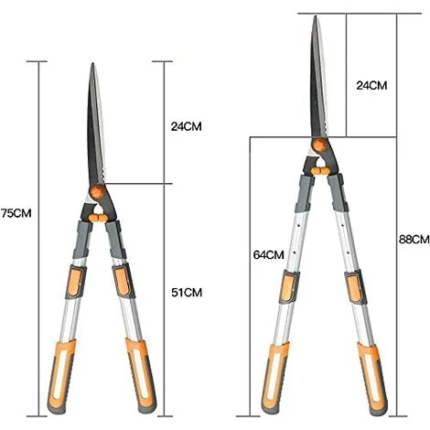 Poignée et tension réglables : avec le simple bouton sur le cisaille à haies manuellement, la tension peut être ajustée à différents types de haies. Le manche télescopique de 75 à 88 cm peut tailler des branches de différentes hauteurs et vous offre une expérience de coupe confortable.