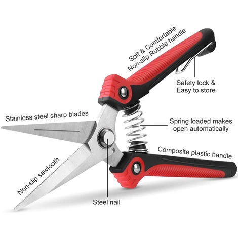 3. 【Ressort d’économie de main-d’œuvre】 Le ressort intégré apporte un rebond confortable et réactif à votre action de coupe qui protégera votre main et votre poignet. Le ressort ouvre doucement les lames après chaque coupe pour réduire la fatigue de la main.