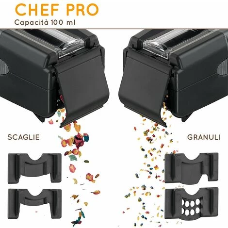 Mangeoire automatique de dernière génération. Chef Pro est en mesure d’accueillir tous les types d’aliments pour poissons, en granulés et en flocons, grâce à ses quatre types de doseurs à appliquer en sortie du réservoir. Le mécanisme de vis interne innovant et breveté assure un dosage constant.