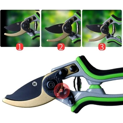 Conception spéciale : ce sécateur a 3 positions qui peuvent être commutées pour répondre aux besoins des utilisateurs de différentes tailles de paume. Vous pouvez changer librement lors de l’utilisation. Lorsqu’il n’est pas utilisé, verrouillezle sécateur pour vous protéger des coupures accidentelles de votre doigt et protégez également les lames.