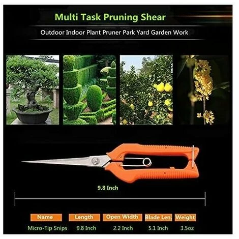 - Cisailles à lame extra longue pour espace étroit – Avec la cisaille à micro-pointe allongée de 9,8 pouces, vous pouvez atteindre l’espace le plus étroit profondément à l’intérieur des fleurs et des petites plantes sans endommager les branches et les tiges principales. Sécateurs à main parfaits pour l’élagage sélectif des petites plantes d’intérieur et d’extérieur, des roses, des herbes, des fleurs, des légumes et des fruits. Lame durable et tranchante – Les ciseaux de jardin construits avec des lames aiguisées avec précision en acier inoxydable pour un rendu lisse, rapide et coupe précise. Les lames de cisailles rapides sont également dotées de dents légèrement dentelées pour saisir les tiges à tailler. Vous pouvez couper des branches jusqu’à 5 mm de diamètre avec nos sécateurs portatifs. Ressort efficace et économe en main-d’?uvre – Les cisailles à micro-pointe allongées sont à ressort, le ressort de haute qualité réduit au maximum la fatigue, la poignée en PVC de conception ergonomique fournit une prise en main confortable. Système de verrouillage facile et s?r – Les cisailles à micro pointe allongées sont livrées avec une boucle de verrouillage en métal, super facile à ouvrir et à fermer, le verrou en fil d’acier durable gardera vos cisailles en sécurité lorsqu’elles ne sont pas utilisées . Tondeuses de jardin multi-go?ts – Les ciseaux de jardin à longue lame peuvent être largement utilisés pour divers travaux de jardinage, vous pouvez utiliser les tondeuses comme cisailles à fleurs, cisailles à tailler, sécateurs de contournement, coupe-bonsa?. Le meilleur choix de cisailles à micro-pointes pour les travaux dans des espaces étroits.