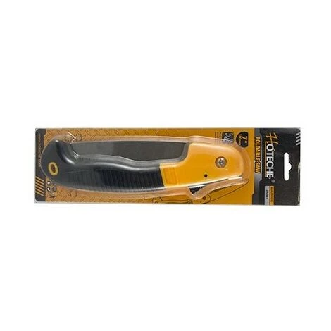 Sega pieghevole per potare 340601. – Mango gommato, ferro. – 230 x 60 x 30 mm. (Sega 180 mm) – 231 g. – Pulsante sul mango per piegare la sega. Dente di tipo Jappish. Doppio triangolare che facilita il taglio. -Mango antiscivolo. – Blister.