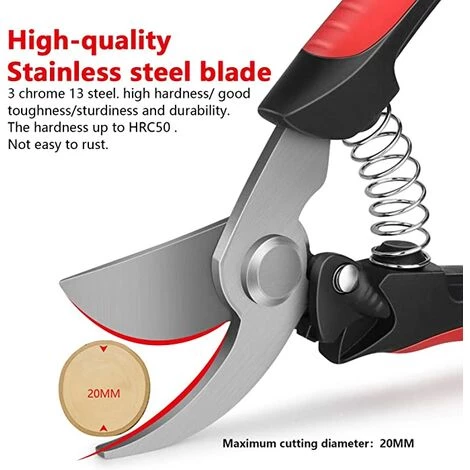 1. 【Sécateur】 ÉPAISSEUR DE COUPE: 5-20 mm; LAME: 45 mm; Longueur: 180 mm Poids: 135,6 gr; Sécateur adapté aux branches et rameaux frais et secs2. 【Sécateur de contournement】 Vous recherchez une paire de ciseaux pour couper proprement et en douceur les tiges de légumes, de roses et d’autres pousses en horticulture et en culture fruitière, ce sont les bons ciseaux « toujours avec vous ». Coupe les branches les plus épaisses de manière très nette et précise. Les ciseaux sont légers et faciles à tenir, le verrou de sécurité est facile à utiliser.3. 【Fabrication de haute qualité】 Petit, léger, ergonomique et très stable, coupes lisses et nettes grâce au revêtement antiadhésif de la lame de coupe.4. 【ERGONOMIQUE】 Poignée TPR en caoutchouc antidérapant à contour souple, adaptée aux droitiers et aux gauchers.5. Particulièrement adapté pour la récolte des fruits, la taille des bourgeons, la coupe des légumes, des branches minces et des fleurs coupées.