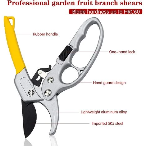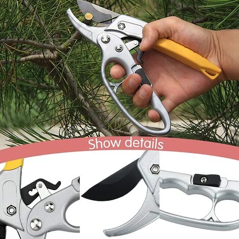 【Sécateur de force】: Avec une poignée enveloppée de caoutchouc, une prise en main confortable sans glisser ; verrou de sécurité coulissant, repousser pour verrouiller et vice versa.