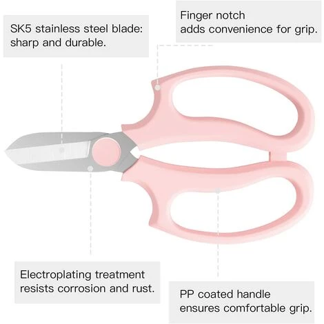 LAME D’ACIER SK5: La lame de ciseaux est en acier haute résistance SK5, qui est très coupante. La surface de la lame a été traitée par traitement de placage, ne rouille pas facilement et permet à votre travail de jardin de devenir plus facile.