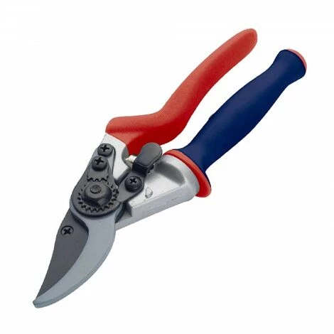 Sécateur muni d’un loquet de verrouillage en escalier pour ajuster l’ouverture des lames et des poignées.
