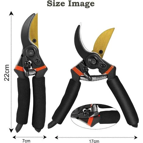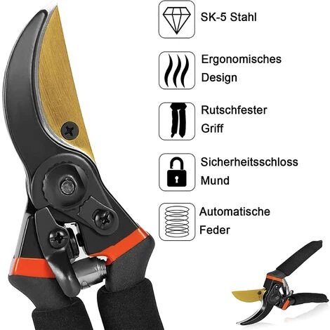 【Ressort de qualité】: Le ressort est en acier de haute qualité, sans déformation, sans rupture. Verrou de sécurité à une main pour sécuriser. La forme du sécateur a été conçue pour que la tension sur les mains soit considérablement réduite même après une période prolongée.