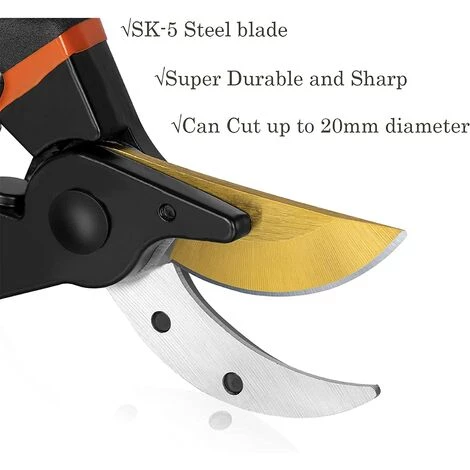 【Sécateur】: Utilisez une lame en acier japonais SK-5 qui est super durable et suffisamment tranchante. La lame en acier entièrement trempé et rectifié avec précision reste tranchante, même en cas d’utilisation intensive. Le sécateur a une lame en acier trempé qui reste tranchante. La lame est très tranchante et peut couper des plantes et des branches jusqu’à 20 mm de diamètre.