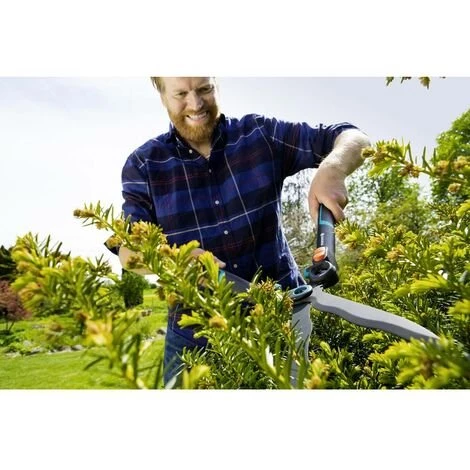 Le 2 en 1 EnergyCut est un cisaille à queue spécial pour un travail facile et sans effort dans toutes les situations de coupe. La transmission à deux niveaux peut être activée ou désactivée en appuyant sur un bouton. Sans boîte de vitesses, le petit angle d’ouverture permet des coupes rapides et dynamiques. Avec la transmission activée, elle coupe sans effort même les branches les plus épaisses. Les lames en acier robustes avec un tranchant de l’arbre permettent une coupe nette. L’angle de travail parfait permet toujours une coupe sûre, car les mains ne touchent pas les haies ou les arbustes et sont ainsi protégées contre les rayures. Les poignées en plastique légères et ergonomiques avec extrémités arrondies garantissent une manipulation facile et un travail sans fatigue. Les tampons de butée en plastique spécial protègent les articulations. Les lames affûtées de précision d’une longueur de 230 mm et le revêtement anti-adhésif garantissent une coupe précise et respectueuse des plantes. 25 ans de garantie garantissent une qualité optimale. Ce texte a été traduit par une machine.